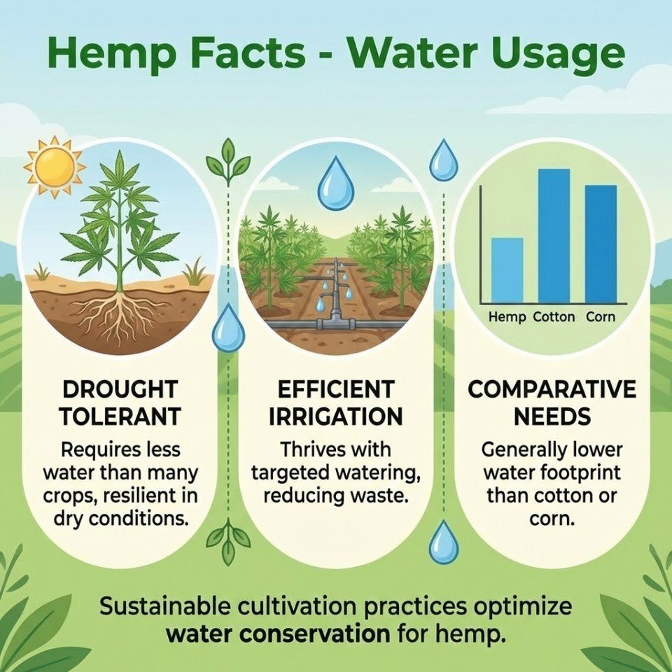 Comparison to Other CropsWhen assessing the environmental impact of crops, water use efficiency is a key metric. Hemp generally requires significantly less water than several commonly grown crops.